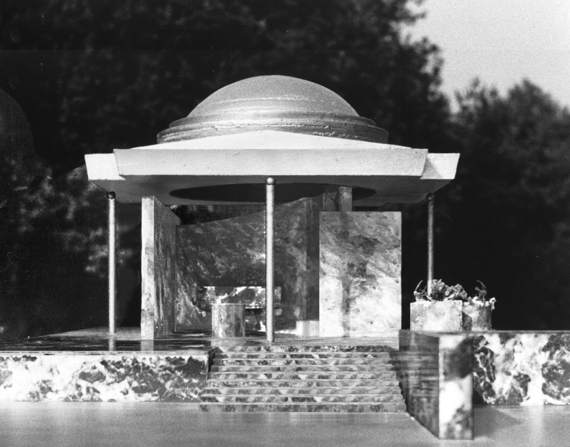Eine Wohnhalle zwischen zwei massiven Türmen, ihre Form in horizontaler Streckung variiert zum Obergeschoss darüber, von dem herab vor der gewölbten Rückwand zwei Treppenläufe kommen, die sich tief im Hang auf einem Podest vereinigen und, hell beleuchtet von oben, den Blick auf die weite Ebene richten, zu der die Wohnhalle sich öffnet.